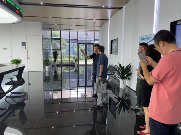 座談前,寧波市知識產權協會常務副會長兼秘書長施軍陪同林崇尚副局長一行參觀了知識產權大廈,并詳細介紹了寧波知識產權保護中心及協會的核心服務功能與特色服務模式。